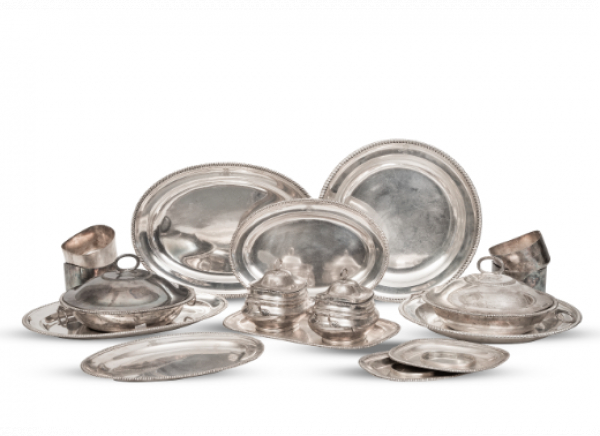 Juego de servir blasonado en plata. Londres, varias épocas y plateros como Robert Sharp: 1777, 1804 y 1906.