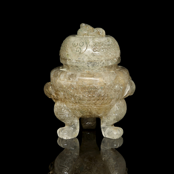 Incensario trípode, tallado en un bloque de cuarzo de notable transparencia.