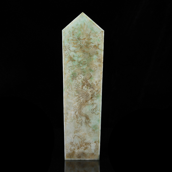 Tabla de jadeíta, de formato trapezoidal rematado en punta, estilo Gui, realizada en jadeíta de una tonalidad verde pálido con atractivas manchas esmeralda y vetas ocre naturales. La pieza presenta una superficie meticulosamente decorada en ambas caras mediante la técnica de grabado fino y dorado. Muestra una escena de un dragón imperial de cinco garras que serpentea entre nubes estilizadas sobre un mar de olas embravecidas. El reverso muestra un largo poema inciso.