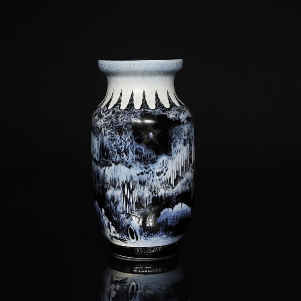 Jarrón de vidrio pintado y grabado por Alphonse-Georges Reyen, reconocido precursor del Art Nouveau en Francia. A finales del siglo XIX, su producción artística estuvo profundamente influenciada por la estética y el arte japonés, carácter que queda claramente reflejado en esta pieza. La obra presenta relieves logrados mediante la superposición de capas de pintura, además de delicados detalles grabados y decorados en dorado.