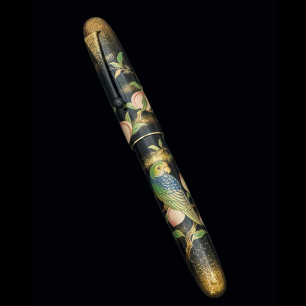 Estilográfica marca NAMIKI, modelo Parrot and Peach, tamaño Yukari Royale, realizada en técnica Togidashi-Taka Maki-e.