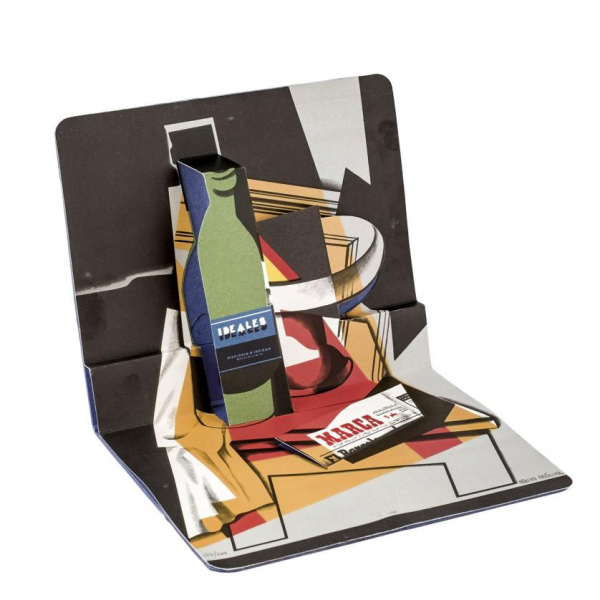 La obra se presenta en forma de carpeta desplegable, con pestaña en forma de pie trasero para exponer.