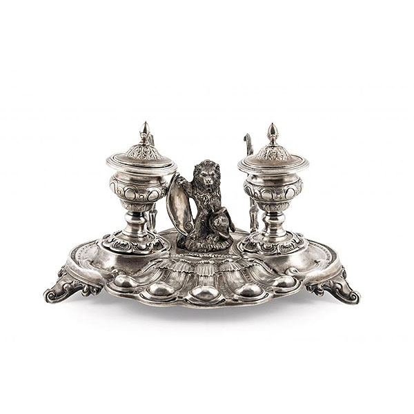 Escribanía en plata española punzonada, con marcas de artífice Larrañaga, localidad o fiel contraste frustra. Base a modo de venera.