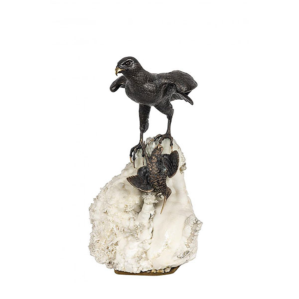 Escultura realizada en bronce dorado y pavonado. Sobre base de aragonito. Muestra un águila dando caza a un ave menor.