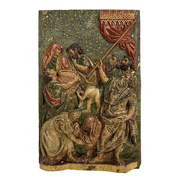 CIRCULO DE ALONSO DE BERRUGUETE. Escena en madera tallada, policromada y dorada. Muestra una escena bíblica de gran detalle realizada en alto y medio relieve.