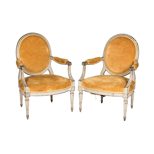 Pareja de sillones de haya lacada en gris con respaldo oval "a la reina" y terciopelo amarillo, época Luis XVI, ffs S.XVIII. Faltas y restauraciones