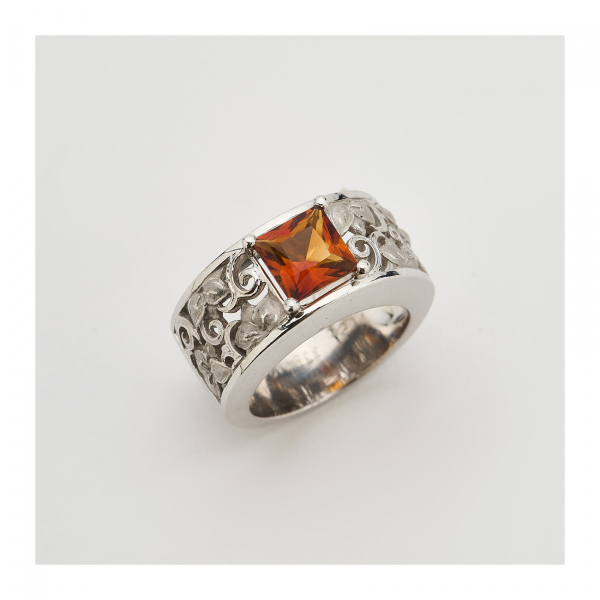CARRERA Y CARRERA. Sortija en oro blanco mate y brillo con citrino central talla carré de 7 x 7 mm. y brazos calados con motivos florales.