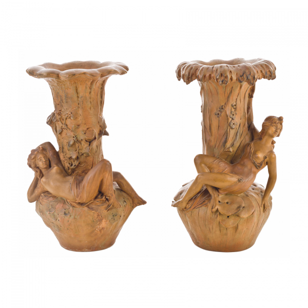 Pareja de jarrones modernistas en barro cocido con escultura femenina en el frente, ppios. del s.XX.