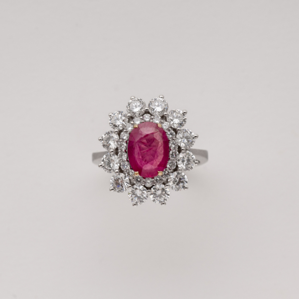 Sortija rosetón en oro blanco con rubí de Myanmar ( Burma ) talla oval orlado por diamantes talla brillante.