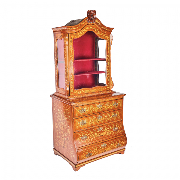 Vitrina holandesa en madera de nogal con marquetería vegetal de maderas finas, fles. del s.XVIII. Cuerpo superior con puerta y laterales acristalados, interior tapizado en tonalidad burdeos con dos estantes y cuatro cajones interiores.