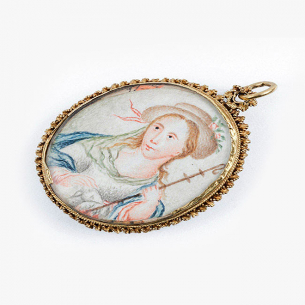 Medallón pinjante devocional del siglo XVIII, en oro amarillo 18 K, oval, acristalado, con un par de bonitas miniaturas policromadas de estilo naïf, en anverso y reverso: San Juan Bautista niño y San Francisco de Asís (recibiendo los estigmas ó en éxtasis). Marco con orla de cordoncillo torsado típico del rococó tardío.