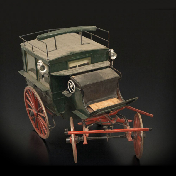 Con cuatro ruedas con caja de madera pintada en verde y rojo, dotado de linternas laterales y asientos interiores. Medidas: 250 x 150 x 190 cm. De estilo utilitario, fue empleado para el transporte de pasajeros en contextos urbanos. La estructura de madera ensamblada y las ruedas de radios con llantas metálicas revelan la técnica artesanal de los talleres europeos del siglo XIX. Conserva pátina original y elementos de forja y cuero.