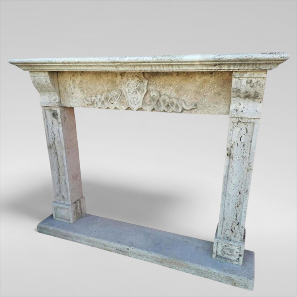 Esta chimenea de estructura arquitectónica equilibrada presenta líneas sobrias y proporciones armónicas, con una decoración de inspiración clásica que combina funcionalidad y refinamiento ornamental. La parte frontal se organiza mediante dos pilastras de fuste plano y moldurado, que sostienen un friso coronado por una cornisa de perfil moldurado y voladizo pronunciado. En el centro del friso destaca un escudo lobulado flanqueado por roleos vegetales entrelazados en bajo relieve, aportando dinamismo a la composición mediante una ornamentación que evoca el lenguaje decorativo del Renacimiento italiano. La superficie del mármol conserva su pátina original, con una textura porosa y matices cálidos propios del travertino, material apreciado por su resistencia y su valor estético en la tradición escultórica y constructiva italiana. Ejecutada a principios del Siglo XX, esta pieza refleja el gusto historicista del periodo, con un lenguaje formal que reinterpreta los códigos decorativos de la arquitectura clásica, adaptándolos a un contexto doméstico burgués. Su presencia sobria y noble, junto con su excelente estado de conservación, la convierten en un destacado ejemplo de artes decorativas vinculadas al interiorismo de inspiración clásica.