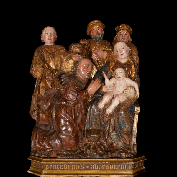 Importante "Adoración" Gótica de Brabante del siglo XV, con peana del siglo XIX.