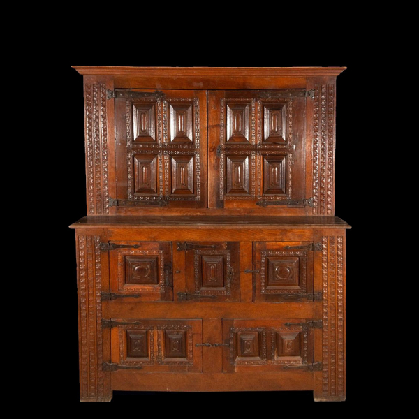 Aparador monumental de dos cuerpos, datado en el Siglo XVI, realizado en nogal y castaño. Presenta puertas con paneles moldurados en relieve y montantes con labores geométricas de gran precisión, reforzadas por herrajes de hierro forjado. El conjunto transmite monumentalidad y responde a la funcionalidad de los aparadores renacentistas, concebidos para almacenamiento y exhibición en espacios nobiliarios. Su estructura sólida y la riqueza de la talla lo convierten en una pieza de extraordinario valor histórico y estético dentro del mobiliario español del Renacimiento.