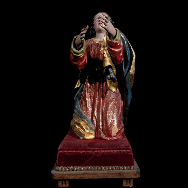 Conservando toda su policromía y dorados originales, en madera, medidas: 31 x 22 x 17 sin peana y con peana 38 x 28 x 20 cm. Lote no sujeto a reserva. Forma conjunto con el San Juan (lote 252 ) y la Dolorosa del lote 254 (posiblemente fueran ambas parte de un Calvario Novohispano). Procedencia: importante colección particular andaluza, palacete sevillano, Sevilla, Andalucía, España.