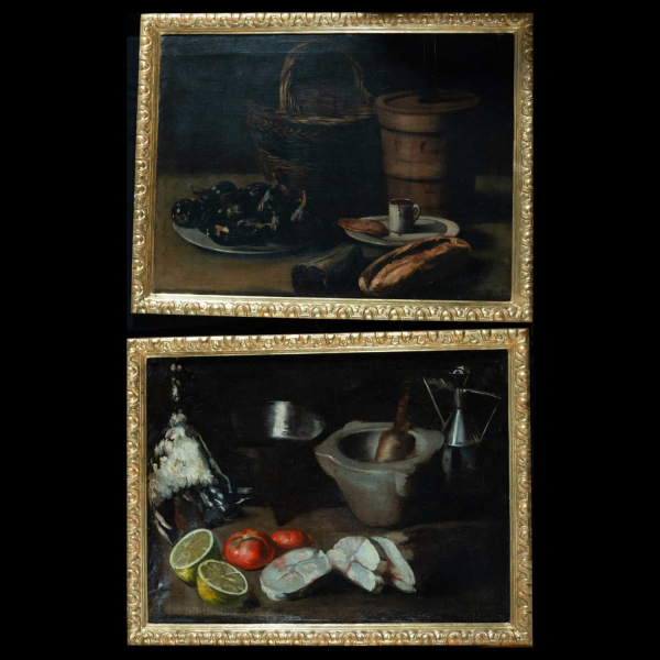 Escuela española de los siglos XVII – XVIII. Pareja de óleos sobre lienzo, medidas cada lienzo: 80 x 60 cm, medidas con marcos: 90 x 70 cm. Pintor documentado en Madrid durante la primera mitad del siglo XVII en Madrid, y cuyo nombre aparece citado en relación con otros pintores madrileños en documentos datados en 1628 y 1659. Otras noticias conservadas parecen aumentar la imprecisión de su figura ya que trabajando en la Corte había al menos dos pintores de igual nombre; uno de ellos había fallecido ya en 1614 y el segundo era vecino de la capital en 1651 y lo fue en años sucesivos. De un gran virtuosismo pictórico, que llegan a ser casi como la firma del maestro, así como conchas marinas, aves y piezas de cerámica traídas de América. Su formulación artística demuestra que conocía bien los recursos del claroscurismo del primer tercio de la centuria con el objetivo de alcanzar contrastes que acentúan el volumen de las formas que pone en juego en cada una de sus obras. Debió de ser artista de cierto renombre ya que aparece citado con frecuencia en los inventarios de propiedades de particulares de la época. Actualmente se conocen obras de este autor en colecciones privadas y públicas de Madrid, París y Londres y en ellas Espinosa demuestra ser un decidido cultivador de ese tenebrismo que no renuncia al efectismo luminoso relacionado estilísticamente con Juan Fernández “el Labrador” (Luna, J. J.: El bodegón español en el Prado. De Van der Hamen a Goya, Museo Nacional del Prado, 2008, p. 160).