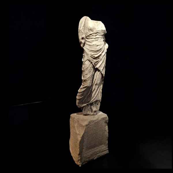Importante y decorativa estatua en marmolina, siguiendo modelos clásicos. Medidas totales con peana: 210 x 56 x 30 cm. Medidas peana: 66 x 56 x 30 cm. Medidas Diosa Ceres: 148 x 53 x 30 cm. Ejemplo similar en el Museu d’Eivissa.