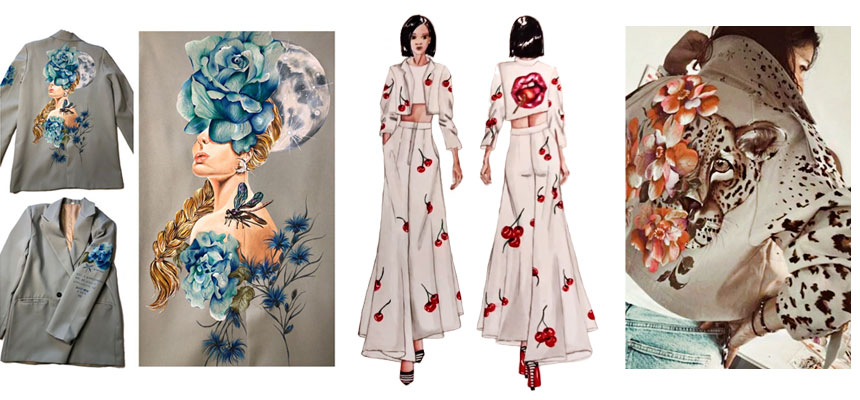Ya puedes consultar en Artened el Catálogo de Primavera 2025 de la artista, para adquirir tu acuarela o obra de arte textil favorita, o también puedes solicitar presupuesto para personalizar una prenda de ropa, accesorio de moda o bolso de lujo. En la imagen de arriba destacamos distintos trabajos realizados por la artista:
