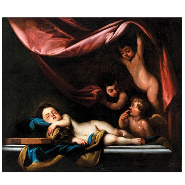 NIÑO JESÚS DORMIDO SOBRE LA CRUZ RODEADO DE ÁNGELES Óleo sobre lienzo. Con marco en madera tallada, dorada y policromada.Medidas: 107 x 125 cm Medidas marco: 150 x 170 cm.