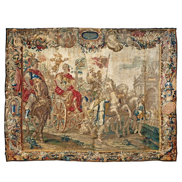 Medidas: 400 x 525 cm En la escena vemos representado en lado izquierdo a César, montado en su carro triunfal tirado por caballos, seguido por soldados y doncellas porteadoras de antorchas. Al fondo a la derecha, la representación de una arquitectura que parece ser la entrada triunfal a la ciudad de Roma. La cenefa está constituida en su parte superior por una cartela central con inscripción y grandes guirnaldas de flores y frutos, entre los cuales aparecen armaduras y flechas de guerra, en torno a un eje central con putti afrontados. En la cartela: AQVILA STATVAE CAESARIS IN SIDENSIAM OBTENTAE VICTORIAE AVGVRIVM ROMAE DONAT. Orla inferior doblada y cosida.