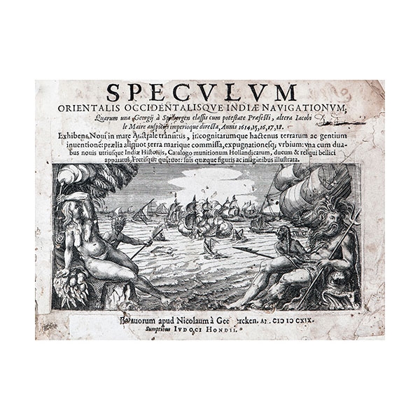 Primera edición en latín de esta importante obra. Van Spilbergen, al mando de una pequeña flotilla de seis barcos de la Compañía de las Indias Orientales Holandesas, navegó a las Molucas a través del Estrecho de Magallanes en 1614, logrando demostrar que era posible llegar a Java desde el este a través de Cabo de Hornos.