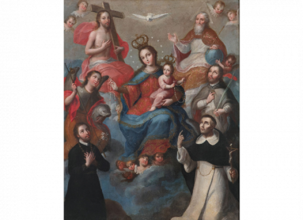 En el centro, la Virgen María, entronizada y coronada, sostiene al Niño Jesús y un rosario, símbolo de devoción, mientras la Santísima Trinidad se representa arriba: Dios Padre bendiciendo, Cristo con la Cruz en expresión meditativa y el Espíritu Santo como paloma. A los lados, el Arcángel Rafael, con un pez que alude a su rol sanador, está junto a un santo jesuita, y San Juan Nepomuceno y Santo Domingo de Guzmán se arrodillan devotamente. Esta composición es comparable a Nuestra Señora del Carmen con la Santísima Trinidad, San José y San Juan Nepomuceno de Páez, en el Monasterio de las Carmelitas Descalzas de Santa Teresa la Nueva, Ciudad de México (fig. 1).