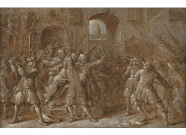 Esta colección de cuatro dibujos que presentamos, pintados por Romeyn de Hooghe -destacado grabador, medallista y pintor holandés- , constituye una serie de estudios preparatorios para los grabados de Hooghe conservados en el British Museum (número de inventario: 1858,0724.190 (Ver: https://www.britishmuseum.org/collection/object/P_1858-0724-190 y representan la secuencia de los hechos que conforman este episodio histórico. Las escenas representadas corresponden a: la llegada de Johan de Witt a La Haya, el asesinato de los hermanos en la misma ciudad, el descuartizamiento de sus cuerpos y, finalmente, el desollado público.