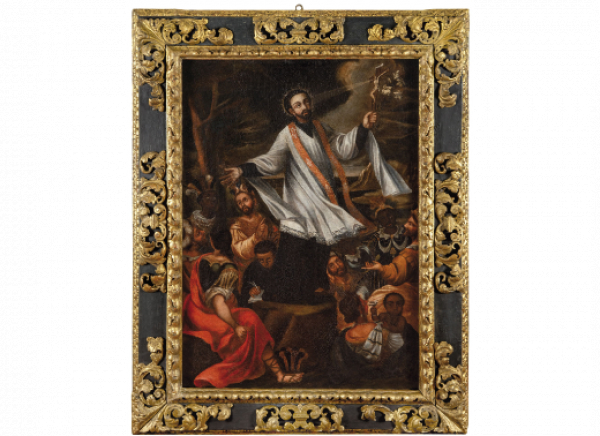 En el centro de la pintura, el santo, con sobrepelliz y estola, alza un crucifijo con la mano derecha. Lo rodean hombres y mujeres de distintas etnias, absortos ante su presencia. A sus pies, un joven novicio jesuita con sotana negra lo observa atento mientras toma notas. La escena se inspira en un grabado flamenco de Geert Edelinck (Amberes, 1640 - París, 1707), difundido a través de “La Vie de Saint François Xavier” (1682) del jesuita Dominique Bouhours.