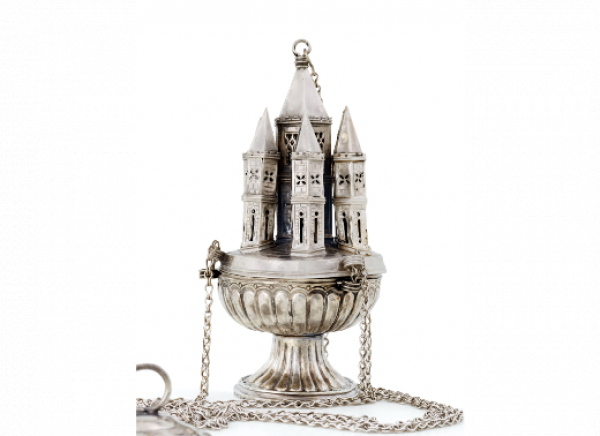 Incensario reyes católicos gótico de tipo arquitectónico en plata española punzonada.