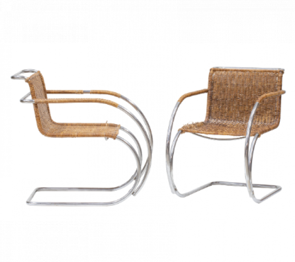 Ludwig Mies Van den Rohe (1886 - 1969). Pareja de sillones modelo MR20, en acero tubular niquelado y ratán. Fabricado h. 1927. Producción 1927-1930. Alemania, h. 1930.