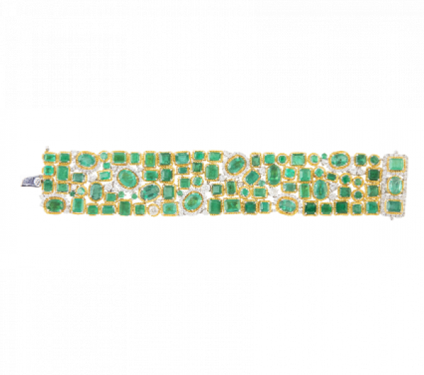 Brazalete ancho articulado cuajado de esmeraldas de distintas tallas. En oro bicolor de 18K.