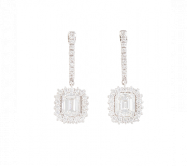 Pendientes con diamantes talla esmeralda orlada de brillantes que penden de criolla con frente de brillantes.