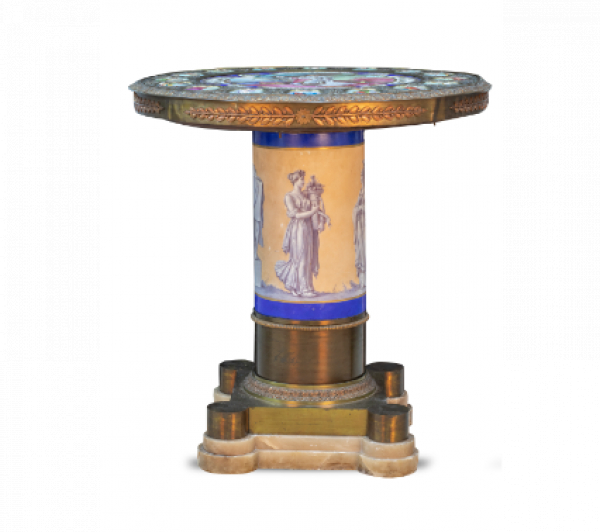 Gueridon Napoleón III de porcelana a la manera de Sévres, esmaltada y dorada, montado en bronce decorado con palmetas. Con marcas en azul cobalto.