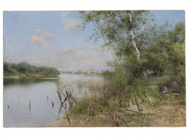 Sánchez Perrier captó con su habitual maestría este lugar en el que la rivera del río ocupa la mitad de la composición. En ella y en primer término describe la menuda vegetación que cubría la orilla, jalonada por pequeñas estacas en medio de las cuales ha colocado sentados a una pareja de niños. Les respalda una arboleda en la que destaca el sinuoso tronco de un álamo con su nervioso ramaje en su entorno.