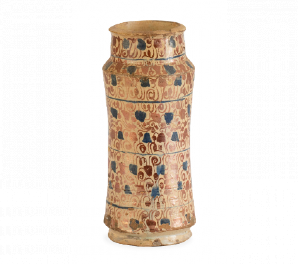 Bote de farmacia de cerámica esmaltada de reflejo metálico y azul. Manises o Paterna, último cuarto del S. XV.