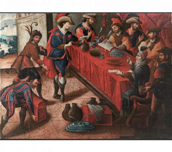 La obra que presentamos constituye una interesante representación del pago de tributos durante el periodo colonial, así como de la importancia de la moneda como medio de pago. No hemos localizado en la pintura andina ninguna representación aislada con este mismo motivo. En este contexto, conviene recordar que Potosí fue el centro minero más importante de América del Sur y la principal fuente de plata de la Corona, con miles de obreros —incluidos indígenas— extrayendo metal del Cerro Rico. La ciudad contaba con la Casa de la Moneda de Potosí desde 1574, donde el metal extraído se transformaba en moneda legal.