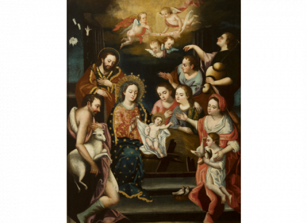 El pintor utiliza un fondo de paisaje y un interior arquitectónico para resaltar la escena principal, La Adoración de los Pastores. Dispone en diagonal a San José, La Virgen y el Niño. Les rodean un conjunto de pastores en actitud de adoración. Unos ángeles portan una filacteria inscrita “gloria in excelsis deo”, texto tomado del evangelio, Lc 2,14, que los ángeles utilizaron para anunciar a los pastores el nacimiento de Jesús.