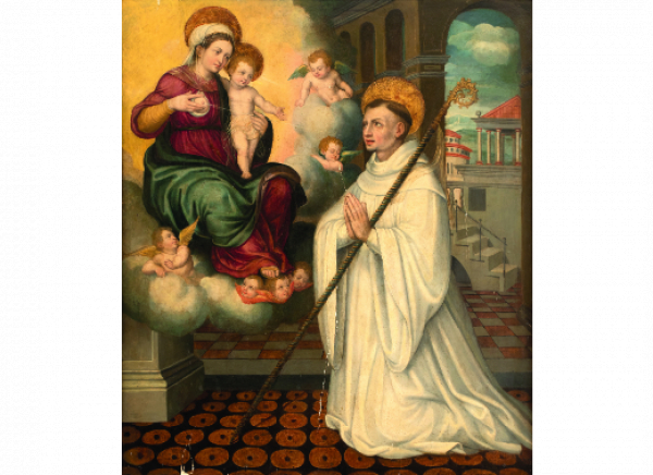 La obra que presentamos representa el milagro de la “lactatio”, incorporado a la biografía del Santo en el siglo XIV. Fue en Chantillon-sur- Seine, cuando el Santo estaba rezando ante la imagen de la Virgen con Niño, invocándola “Mostra te esse matrem”. Es entonces, cuando se produce el milagro en el que el Santo recibe un chorro divino de la leche de la Virgen. Sobre esta mística visión surgieron diversas leyendas como la que decía que las gotas cayeron sobre la boca, los ojos, y la túnica del santo que se volvió blanca; como el hábito de los monjes del Cister.