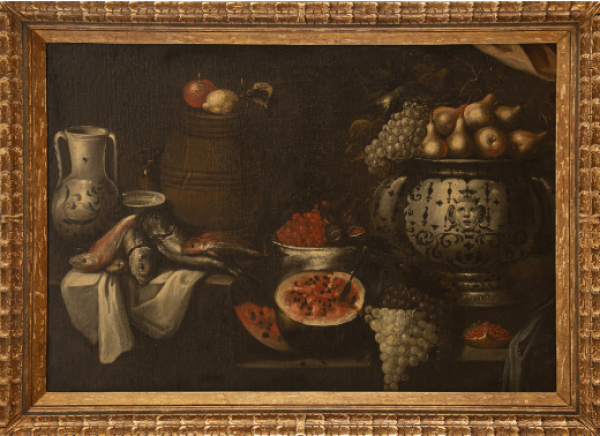 Bodegón con sandías, uvas, peras, limones, pescados y otros elementos de cerámica sobre un pedestal de piedra.
