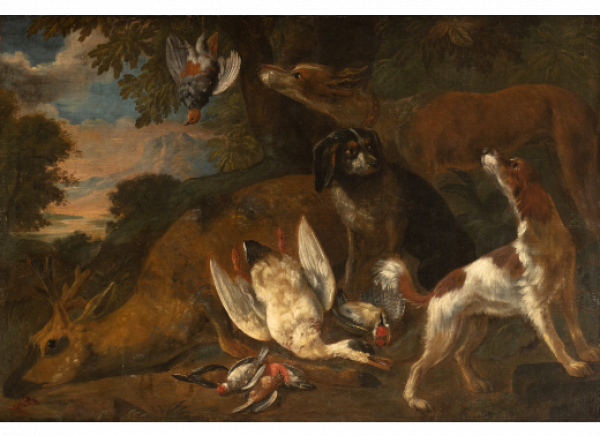 Naturaleza muerta con corzo, perros, jilgueros sobre un paisaje.