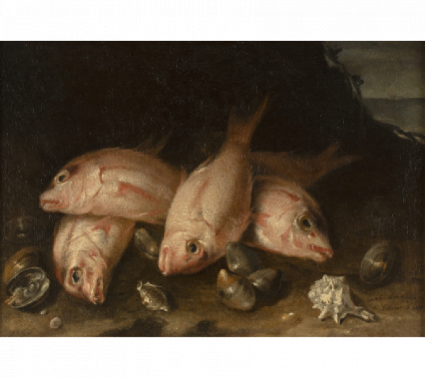 Sobre un fondo de paisaje, Pedro de Medina, moldea suavemente con un colorido rosáceo un grupo de peces "pajeles" y dispone en un primer plano una sucesión de almejas y conchas que hacen avanzar algo más la composición dotándola de un mayor dinamismo. Con una luz uniforme y pequeños efectos lumínicos con maestros toques de blanco sobre los peces y conchas, la mirada del espectador pasa de un elemento a otro sin detenimiento admirando la exquisita elegancia del bodegón que presentamos.