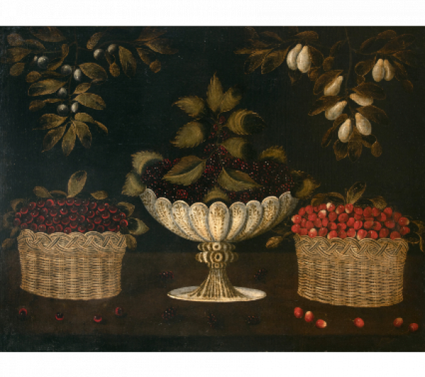 Pareja de bodegones: sobre una mesa centro de cerámica con frambuesas y dos cestos con cerezas, encima ramas con peras; sobre una mesa calabazas y tomates y dos cestos con pepinos y berenjenas, encima ramas con melocotones y ciruelas