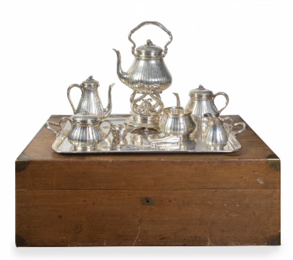 Está formado por: bandeja, samovar, lechera, cafetera, tetera, 2 pinzas para el azúcar, depósito para el té y cuenco.