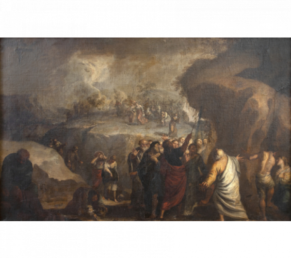 El lienzo que presentamos es una magnífica representación del pasaje de Moisés haciendo brotar el agua de la roca de Horeb, basado en el Libro del Éxodo del Antiguo Testamento. Sobre un paisaje la figura de Moisés que golpea con su cayado sobre la roca de Horeb del que sale un potente chorro de agua, para aplacar la sed del pueblo de Israel antes de cruzar el desierto.