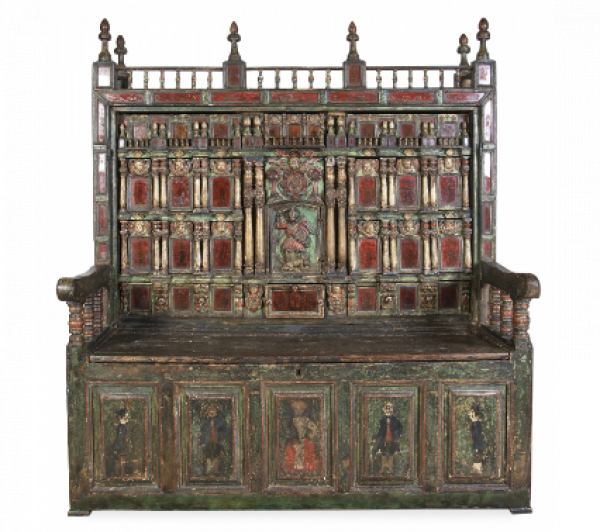 Arquibanco de madera tallada, policromada con aplicaciones de cristal pintado o "verre églomisé".