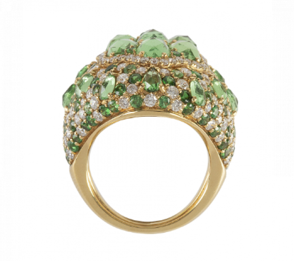 Sortija lanzadera de tsavoritas de talla oval fantasía y brillantes en diseño de gran óvalo bombée.