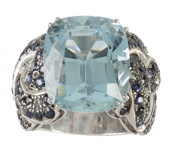 Sortija con gran aguamarina central de intenso color en talla cojín, con montura de bandas trenzadas de zafiros adornadas con brillantes.