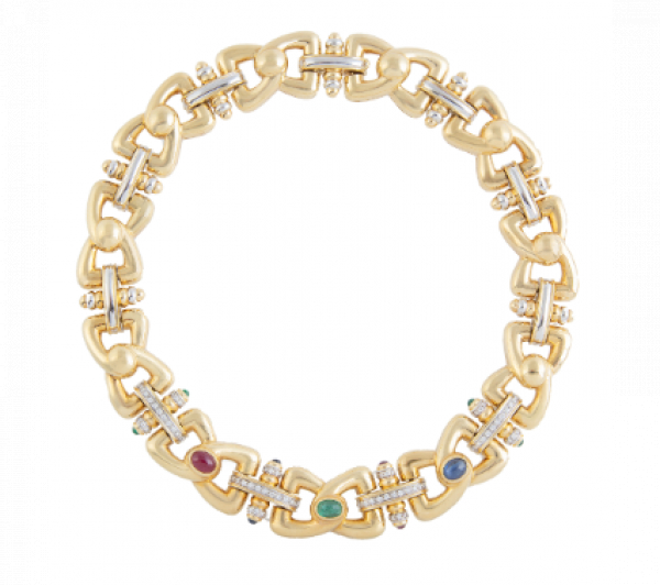 Gargantilla articulada de oro con once centros de piezas con diseño de lazo, y en el frente tres cabuchones de esmeralda, rubí y zafiro combinados con bandas de brillantes