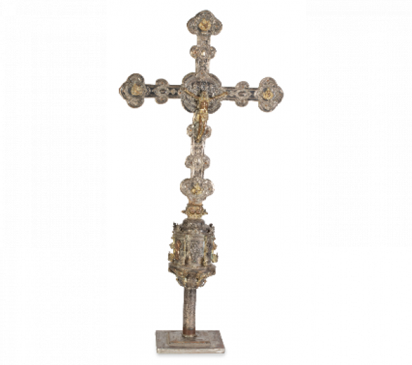 Cruz procesional con alma de madera, de plata en su color y aplicaciones de bronce dorado. Con marcas DIO/RMZ.